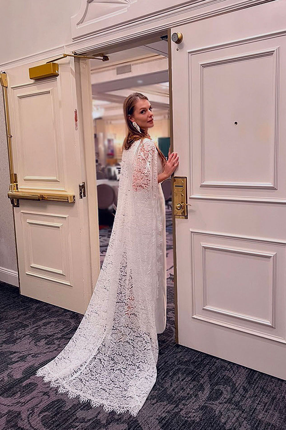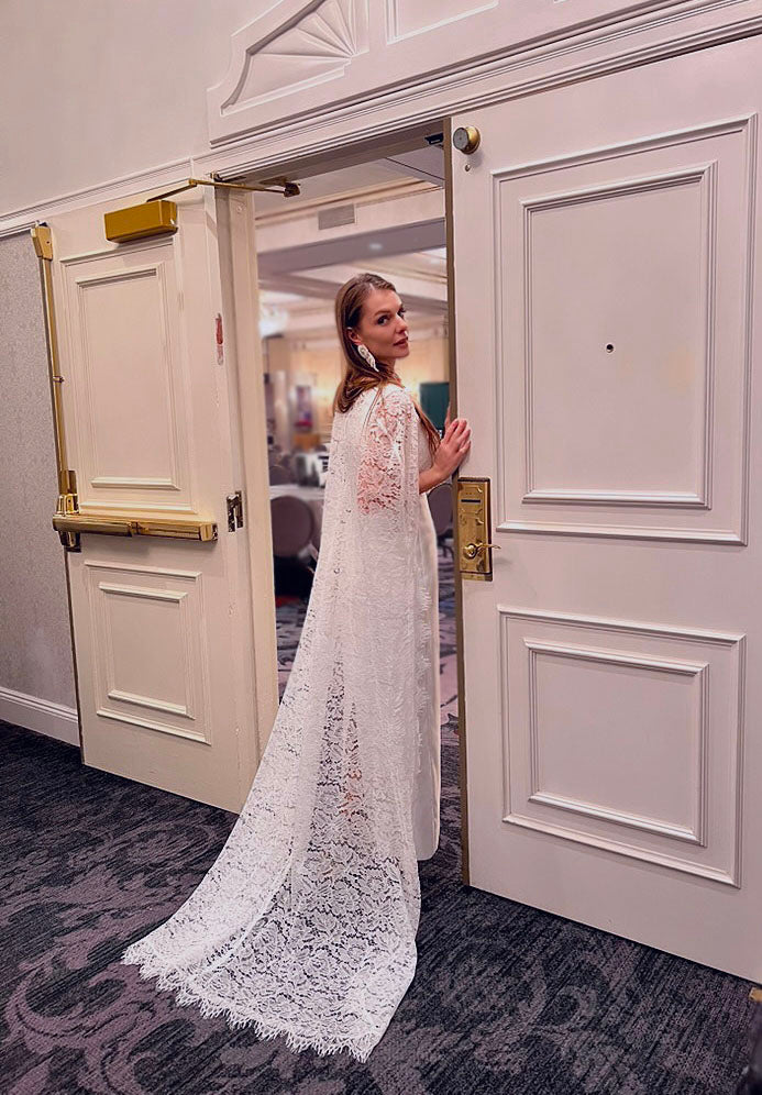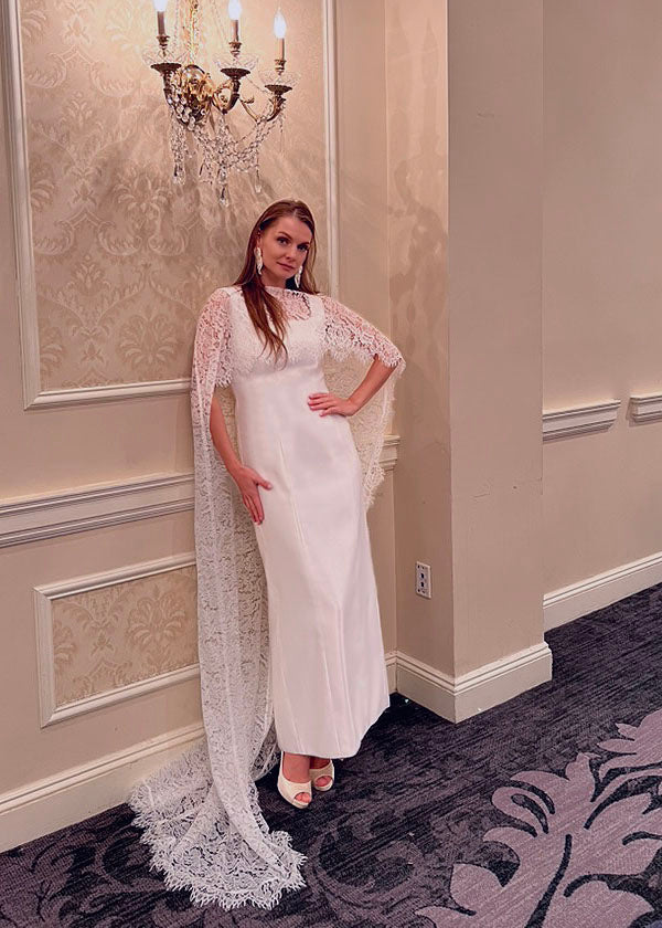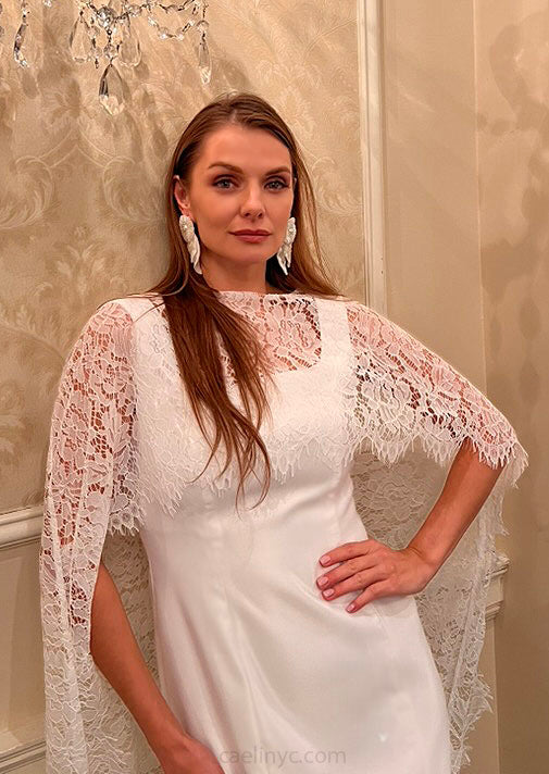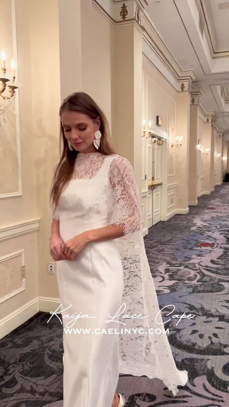 Update any outfit with this beautiful light weight delicate lace long cape with scalloped edges.