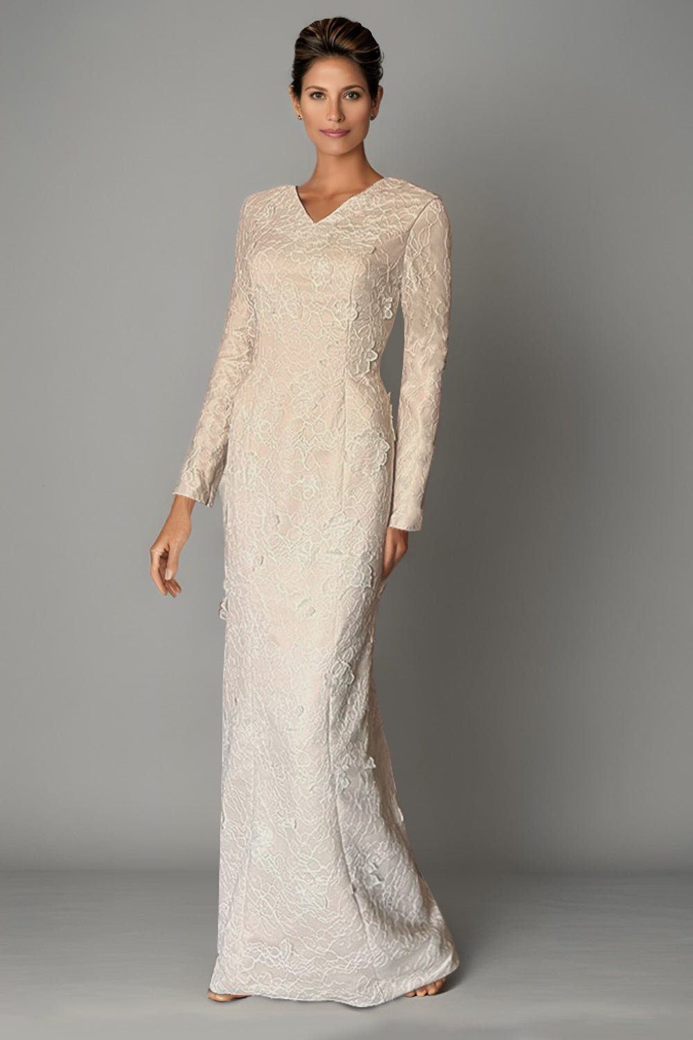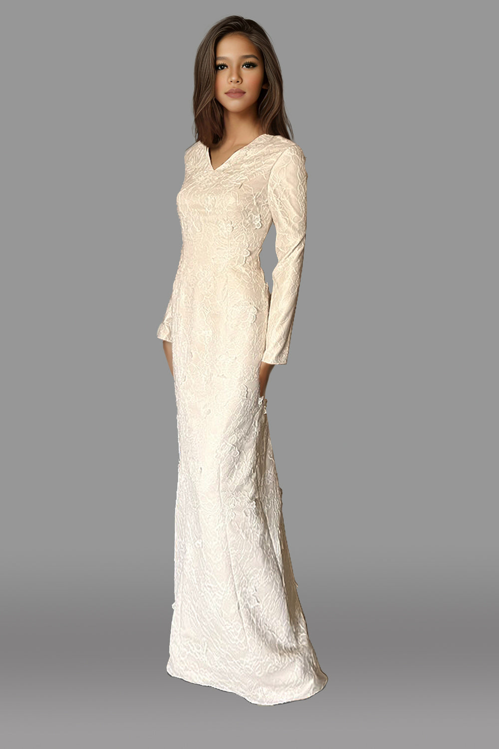 Elegant long gown with V-neckline, long sleeves structured lace dress. scattered lace appliqués all over. Scalloped lace hem and sleeve edges.