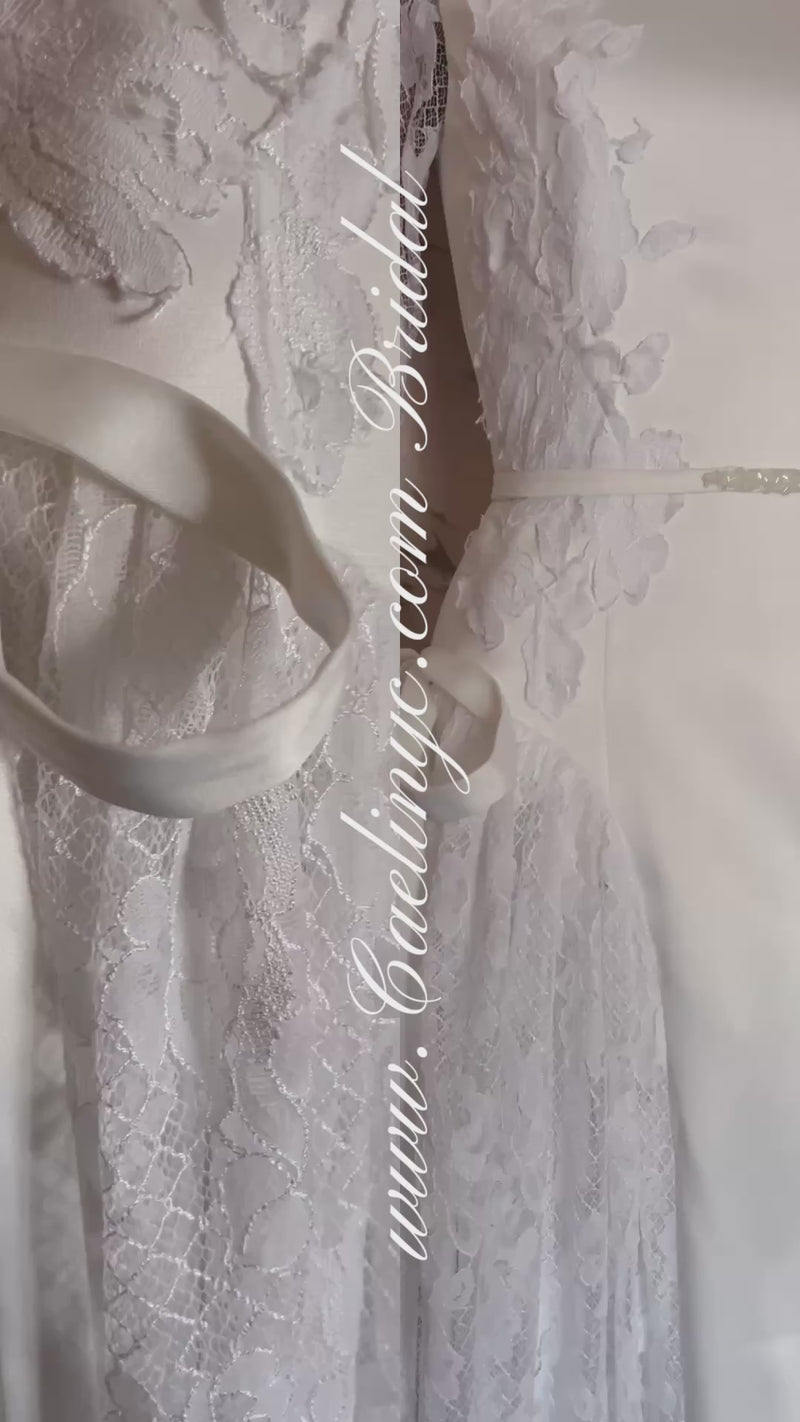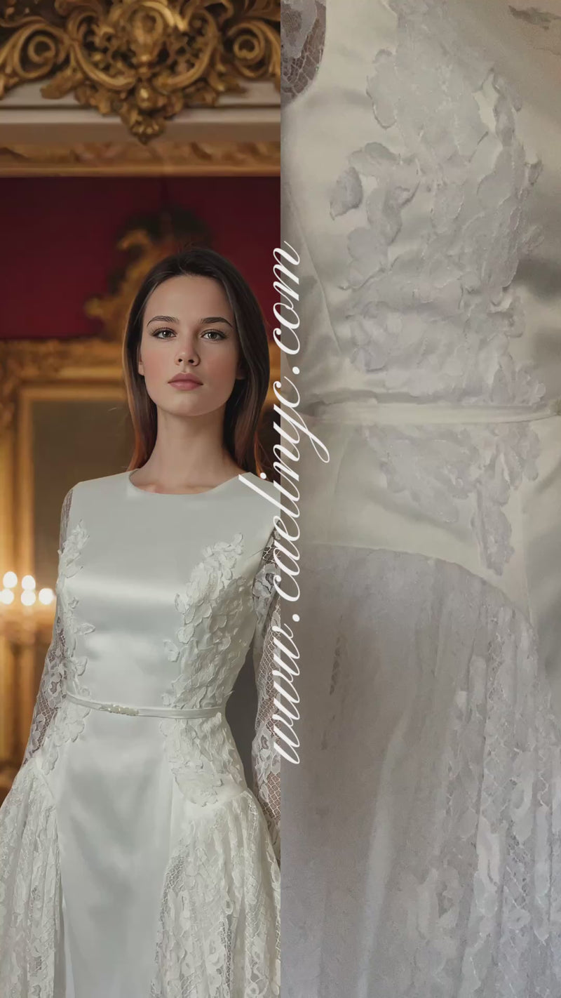 This Basque waist gown features modern and timeless details, a fine marriage of delicate lace and structured duchess satin fabric, adorned with cut-out lace appliqués on the side bodice and bows on each side of the lace skirt. Comes with beaded removable sash belt.