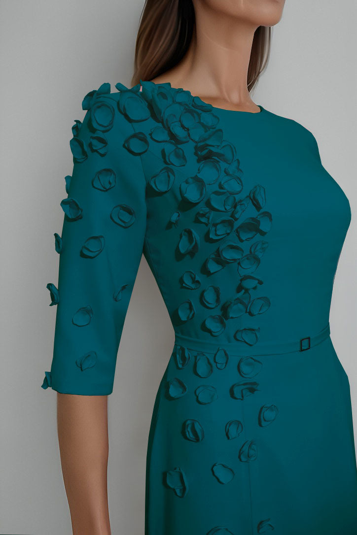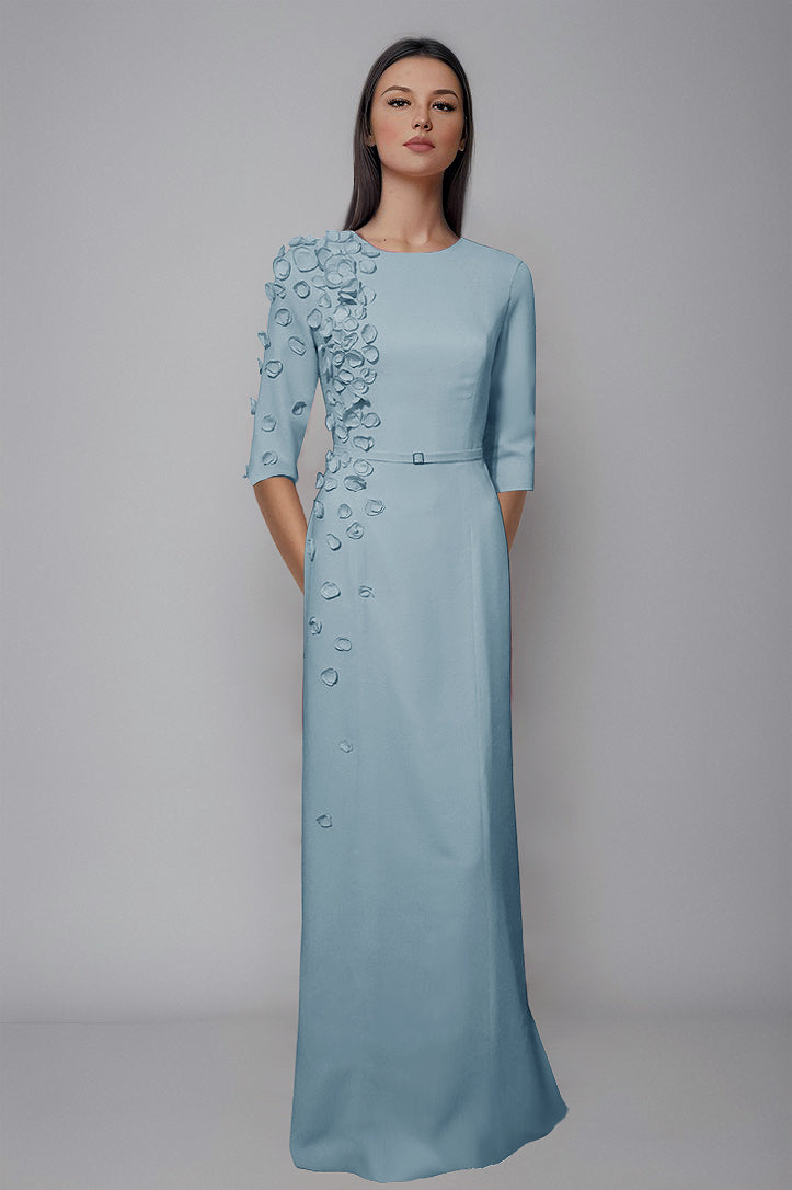 Mae Light Blue Crepe Column Gown with 3/4 Sleeves - Wedding Guest Dress