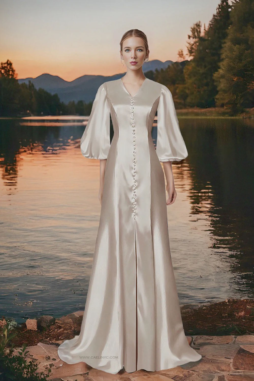 Elegant charmeuse satin gown with balloon sleeves and button down style in the front.