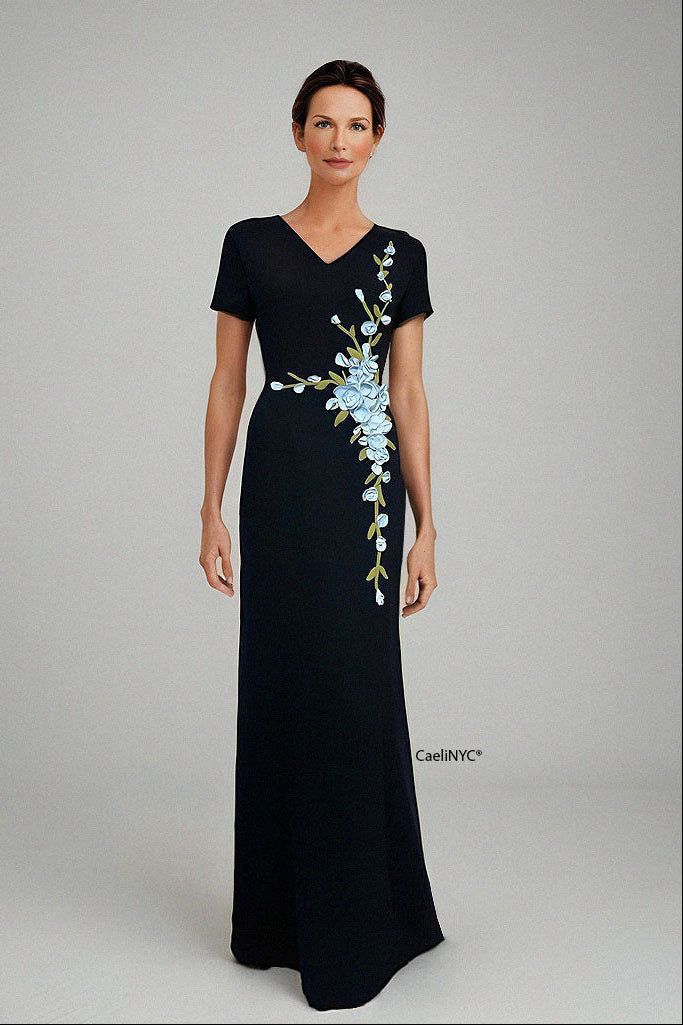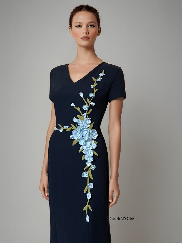 Valley Navy Blue Gown with Sleeves and Floral Appliques