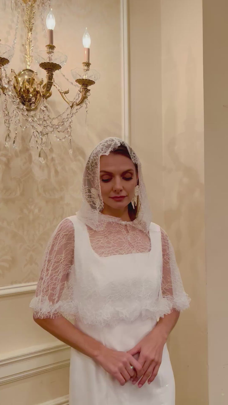 Floral lace capelet mantilla with beautiful cut-out flower appliqués around the scalloped hem