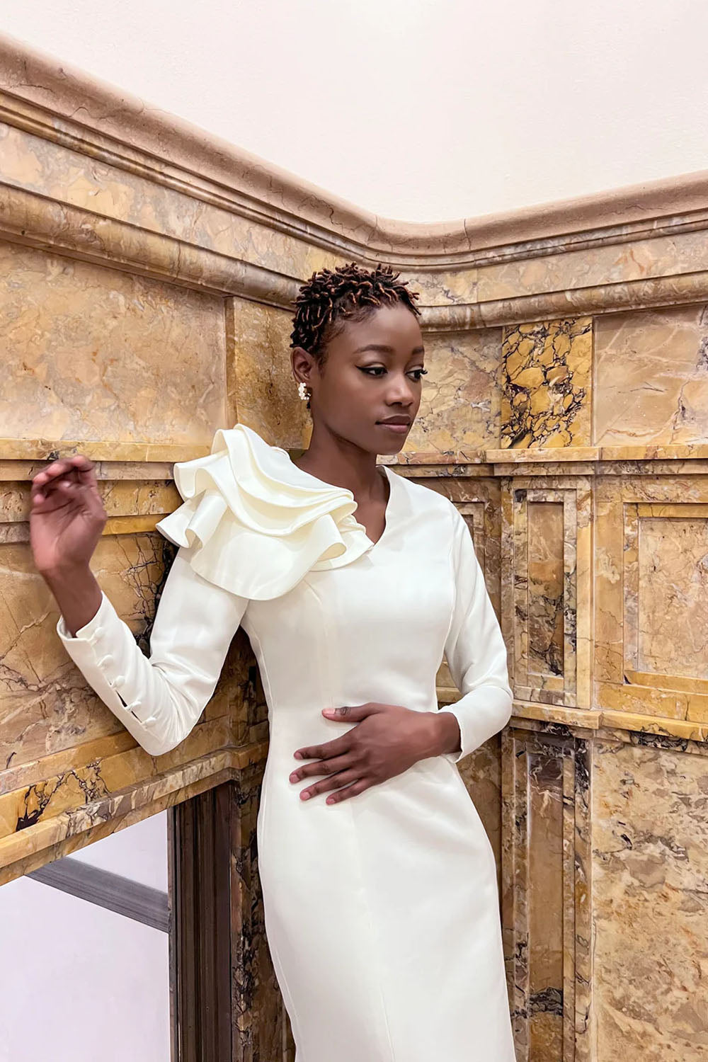 Luxurious duchess satin gown with high V neck, ruffle detail on the shoulder and long sleeves. The epitome of elegance and class.